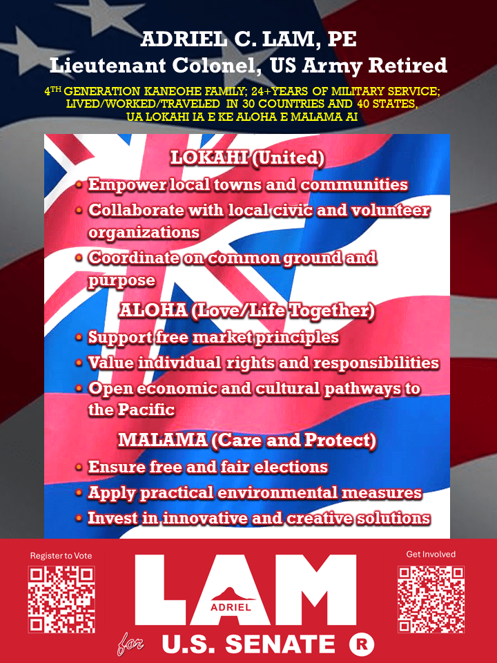 LAM4ALOHA is the authorized campaign of Adriel Lam for U.S. Senate, Hawaii. Aloha is the heart of God for the people of Hawaii. Aloha is not codified by law, but lived, shared and manifested in our daily lives, to include public life. Adriel brings a lifetime of Aloha to public service in Hawaii.